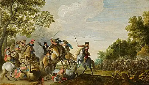 Cornelis de Wael war ein spezialisierter Maler von Schlachtszenen. Eine Reihe dieser Gemälde, die Schlachten zu Lande (wie die Belagerung von Ostende, im Museo del Prado) und zu Wasser (wie die Schlacht zwischen Christen und Türken, im Museo Poldi Pezzoli) darstellen, sind erhalten geblieben. Die breite Komposition einiger seiner militärischen Werke steht derjenigen der führenden flämischen Kriegskünstler Pieter Meulener und Adam Frans van der Meulen nahe, während ihre statische Qualität an die Arbeiten von Sebastian Vrancx erinnert.[11]