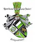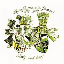 Der Wahlspruch der Rheno-Nicaren Einig und treu! unter dem Wappen weist auf den Corpsgeist der Studentenverbindung hin.