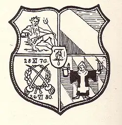 Erstes Wappen mit „Vater Rhein“ und Münchner Kindl (1880)
