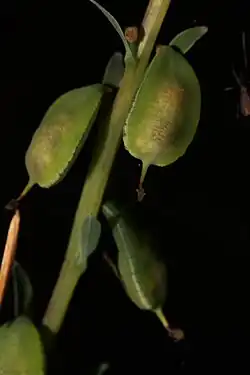 Die Kapselfrucht ist bei einer Länge von 1 bis 1,5 Zentimeter und einem Durchmesser von 0,4 bis 0,5 Zentimeter eiförmig. Die schwarzen Samen weisen einen Durchmesser von etwa 3,5 Millimeter und zahlreiche kleine Höcker auf. Die Früchte reifen zwischen Mitte Mai bis Ende Juni.