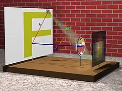 Die Abbildung soll mit einer idealen Linse erfolgen. Betrachtet man ein infinitesimales Oberflächenelement der Wand von der Größe , das sich auf der optischen Achse befinden soll, dann beträgt die photometrische Lichtstärke I senkrecht zur Oberfläche (also in Richtung der Linse):