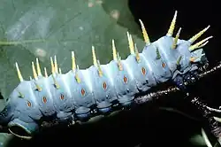 Junge Raupen sind weißlich gefärbt, schwarz quergestreift und auf allen Körpersegmenten mit stark verzweigten Dornen versehen. Ausgewachsene Raupen haben eine hellblaue Grundfarbe, auf jedem Körpersegment rötliche Tracheen sowie dünne gelbe Ausstülpungen (Scoli).