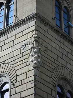 Noch stärker als im literarischen Bereich engagierte sich Cosimo auf dem Gebiet der bildenden Kunst. Er ließ auf eigene Kosten Kirchen und Klöster erbauen und künstlerisch ausstatten. Damit betätigte er sich, obwohl er formal nur ein einfacher Bürger war, auf einem Gebiet, das traditionell weltlichen und geistlichen Machthabern vorbehalten war. Im 14. und frühen 15. Jahrhundert wäre eine ganz aus privater Initiative entfaltete Bautätigkeit solchen Umfangs in Florenz noch undenkbar gewesen. Erst der gesellschaftliche Wandel, der mit der fortschreitenden Entfaltung des Humanismus zusammenhing, machte derartige Vorhaben möglich. Eine humanistisch geprägte Mentalität zeigte sich auch im Willen zur Selbstdarstellung. Cosimo legte Wert darauf, dass seine Funktion als Auftraggeber sichtbaren Ausdruck fand. So ließ er an einer Kirche in Jerusalem, die mit seinen Mitteln restauriert wurde, sein Wappen anbringen, das fortan den Pilgern, die ins Heilige Land zogen und die Kirche aufsuchten, ins Auge fiel. Auch in Florenz weisen die von ihm gestifteten Bauten überall das Familienwappen der Medici auf. Nicht nur an Fassaden und Portalen, sondern auch an Kapitellen, Konsolen, Schluss-Steinen und Friesen ließ er es anbringen. Zwar waren Familienwappen in Kirchen damals in Florenz üblich, doch die Häufigkeit, mit der Cosimo das seinige überall ins Blickfeld der Öffentlichkeit rückte, war einzigartig und fiel auf.[90]