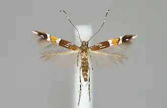 Die Falter erreichen eine Flügelspannweite von 6 bis 8 Millimeter. Die Stirn (Frons) ist grau und in Richtung Stirnplatte (Clypeus) weiß. Der Scheitel (Vertex) und die Nackenbüschel sind dunkelbraun. An den Seiten und in der Mitte des Kopfes befinden sich weiße Linien. Der Halskragen ist dunkelbraun. Das erste Segment der Labialpalpen ist sehr kurz und weiß. Das zweite Segment ist 4/5 so lang wie das dritte Segment, es ist innen weiß, außen dunkelbraun und mit einer weißen Längslinie versehen. Das dritte Segment ist weiß und hat außen eine braune Linie.
