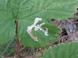 Die Raupen entwickeln sich an Echtem Hopfen (Humulus lupulus), Japanischem Hopfen (Humulus scandens) und Boehmeria nipononivea. Die Weibchen legen die Eier an den Mittelrippen oder anderen großen Adern der Blätter ab. Durch die Fraßtätigkeit der jungen Raupen entsteht entlang der Blattader eine unregelmäßige längliche Mine mit einem seidigen Fraßgang. Sie dient den Raupen als Unterschlupf, wenn sie nicht fressen. Ausgehend von diesem Gang legen die Raupen später Verzweigungen in alle Richtungen an, sodass eine sehr unregelmäßige, gelblich weiße Platzmine entsteht, in der Raupenkot verteilt ist. Die Raupen können die Mine wechseln, in großen Blättern können auch mehrere Minen vorhanden sein. Die Raupen können von Juli bis September angetroffen werden. Im Herbst fertigen sie einen länglichen, weißen Kokon an und überwintern darin im Detritus am Boden. Die Falter fliegen von Ende Mai bis Juli und können von den Wirtspflanzen herausgeklopft werden. Gelegentlich kommen sie auch ans Licht.[1]