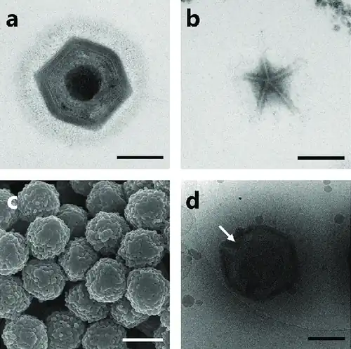 Kryo-EM-Bild von Cotonvirus japonicus mit offenem Stargate (Pfeil).[A. 1] | ||||||||||||||||||||