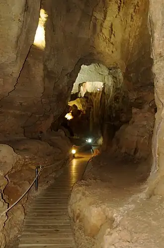 Ursprünglich wurde der Höhleneingang durch eine üppige Vegetation verdeckt, so dass man eine Einstiegsöffnung oberhalb des Höhleneingangs benutzte, die heute noch über eine Treppe zu erreichen ist. Die Temperatur in der Höhle zwischen 18 und 19 Grad und das stets vorhandene Wasser machten die Höhle als Behausung sehr gut geeignet. Der vom Feuer aufsteigende Rauch konnte durch drei Öffnungen nach oben abziehen. Die Decke des Höhleneingangs ist rußgeschwärzt durch die von den Bewohnern zum Schutz gegen eindringende Raubtiere entzündeten Feuer. Während die Wände im vorderen Höhlenteil verhältnismäßig glatt emporsteigen, sind die Wände und Decken im hinteren Teil stark zerklüftet und von Stalagmiten und Stalaktiten geformt. In Zeiten der Ersterkundung war der Höhlenboden übersät von Gesteinsbrocken und abgebrochenen Wand- und Deckenausformungen. Heute ist der Boden mit einem hölzernen Gehweg von über 400 m Länge belegt. Am Ende des Weges befindet sich ein unzugänglicher See.