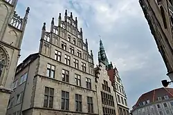 - ↑ Siehe hierzu: Karl E. Mummenhoff: Die Profanbauten des westfälischen Herrenstandes. In: Der Raum Westfalen, Band IV/2, Münster 1965, S. 238–239. Hier sind vor allem das 1904 durch einen Brand zerstörte Haus Roggenmarkt 11 und das nach dem Zweiten Weltkrieg wiederhergestellte Haus Prinzipalmarkt 11 zu nennen. Beide entstanden bereits um 1490.
