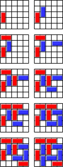 Jeder der zwei Spieler hat einen Satz von Spielsteinen, von denen jeder genau zwei über Kante aneinander angrenzende Felder bedecken kann. In der Abbildung sind die Steine zur Veranschaulichung der Zugfolge rot und blau gefärbt; sie können aber auch für beide Spieler die gleiche Farbe aufweisen. Wenn ein Spieler an der Reihe ist, muss er genau einen Spielstein platzieren, und zwar horizontal oder vertikal, wobei weder der vereinbarte Spielfeldrand überschritten noch auf einem bereits belegten Feld gestapelt werden darf. Es besteht Setzpflicht; wenn ein Spieler in dieser Situation keine zwei nebeneinander liegenden freien Felder mehr findet, hat er in der normalen Variante verloren. In der umgekehrten Variante bedeutet die Unfähigkeit zur Platzierung eines Steins den Sieg.