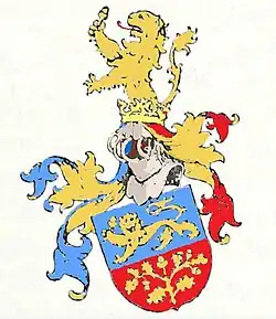 In blauem Schildeshaupt ein goldener Löwe, eine goldene Eichel haltend. Im roten Schildesfuß ein goldener Eichenzweig.