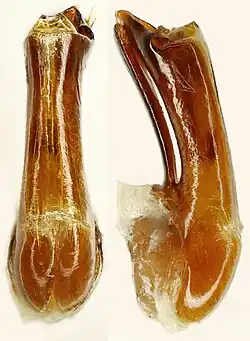 Abbildung 14 zeigt das männliche Geschlechtsorgan (Aedeagus). Eine genauere Zeichnung und die Abbildung der weiblichen Genitalien findet man bei Clarke.[2] Eine sehr ausführliche Beschreibung des adulten Käfers mit vielen Detailzeichnungen findet sich bei Blackwelder.[19]