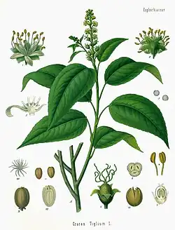 - ↑ Wolfgang Schneider: Lexikon zur Arzneimittelgeschichte. Sachwörterbuch zur Geschichte der pharmazeutischen Botanik, Chemie, Mineralogie, Pharmakologie, Zoologie. Govi-Verlag, Frankfurt a. M. Band 5/1 (1974), S. 389–390: Croton (Tiglium) (Digitalisat)