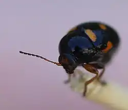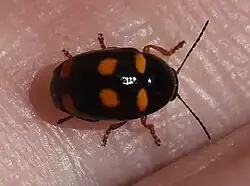 Die Käfer erreichen eine Körperlänge von 3–4,5 mm.[1][2] Sie besitzen eine schwarze Grundfarbe. Die Käferart weist einen ausgeprägten Geschlechtsdimorphismus auf. Die Stirn der Männchen ist vollständig gelb gefärbt. Die Weibchen besitzen lediglich einen gelben Scheitelfleck.[1][2] Die Männchen besitzen entlang dem Vorderrand des Halsschildes einen breiten gelben Saum, der sich von den vorderen Halsschildecken seitlich nach hinten fortsetzt.[2] Auf den Flügeldecken befindet sich jeweils an der Basis, auf halber Länge sowie am Hinterrand ein größerer gelber oder gelbroter Fleck. Ein weiterer gelber oder gelbroter Fleck befindet sich auf halber Länge am äußeren Seitenrand der Flügeldecken. Die basalen Glieder der Fühler sind gelbrot gefärbt, die äußeren Fühlerglieder sind verdunkelt. Die Beine sind überwiegend gelb, die mittleren und hinteren Femora sind häufig verdunkelt. Es kann generell zu Abweichungen in der Färbung der Geschlechter kommen.[2]