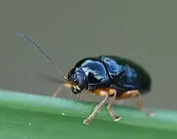 Die Käfer erreichen eine Körperlänge von 3–4,5 mm.[1][2] Sie besitzen eine blauschwarze Grundfarbe mit Metallschimmer. Der Vorderkopf oberhalb des pechschwarzen Munds bis an die Facettenaugen heranreichend ist gelb. Die etwa vier basalen Fühlerglieder sind gelb, die restlichen sind verdunkelt. Die Käferart weist einen Geschlechtsdimorphismus auf. Die Männchen besitzen an der Innenseite der Augen oberhalb des Fühleransatzes jeweils einen kleinen gelben Fleck. Ihre mittleren und hinteren Beine sind schwarz, die vorderen Femora sind teils verdunkelt, ansonsten sind die vorderen Beine gelb. Bei den Weibchen sind alle Beine vollständig gelb gefärbt. Die Mandibeln sind bei beiden Geschlechtern gelb. Die Elytren weisen in den meisten Fällen regelmäßige Punktstreifen auf.[1][2] Die Fühler sind bei den Männchen etwa so lang wie ihre Körpergröße, bei den Weibchen sind diese deutlich kürzer.