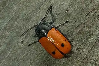 Der Käfer hat eine Körperlänge von 5,5–8 mm.[1][2] Die Grundfarbe des Käfers ist schwarz. Die Käfer besitzen eine ovale Gestalt. Der Seitensaum des Halsschilds ist schmal aufgebogen.[2] Der Halsschild ist außerdem glänzend und einzeln punktiert.[2] Die Flügeldecken sind orangerot gefärbt. Es befindet sich vorne ein schwarzer Fleck sowie im hinteren Drittel auf gleicher Höhe zwei schwarze Flecke. Diese können bei manchen Exemplaren auch miteinander verbunden sein.[2] Des Weiteren weisen die Flügeldecken in Längsrichtung schwarze Punktreihen auf.
