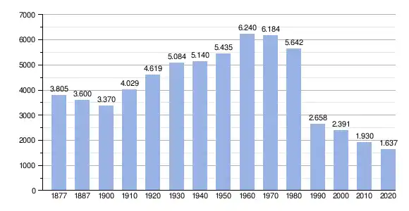 Durch Fortzug in die umliegenden Städte ist die Bevölkerung seit den 1980er Jahren stetig gesunken.