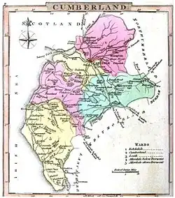 Cumberland war verwaltungstechnisch anders als die übrigen Grafschaften, die in hundreds unterteilt sind, in fünf wards unterteilt: Allerdale above Derwent, Allerdale below Derwent, Cumberland, Eskdale und Leath.