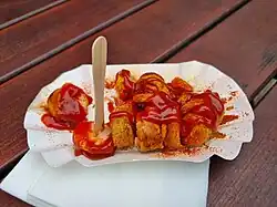 - Currywurst wird als deutsche Spezialität auch international verkauft, so etwa in London,[30] Paris[31] oder New York City.[32]