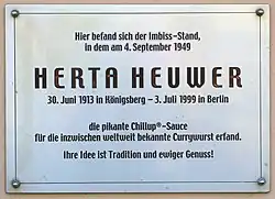 - ↑ Fotos: Gedenktafel für Herta Heuwer. In: Bezirksamt Charlottenburg-Wilmersdorf, 2010, aufgerufen am 2. Mai 2019.
