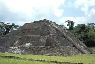 - Edificio II: Dreifach abgestufte Pyramide mit Mitteltreppe; nur die Vorderseite ist freigelegt
