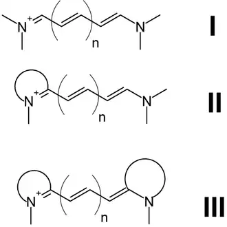 Die Kettenglieder zwischen den beiden Stickstoffatomen liegen normalerweise in der stabileren all-trans-Form vor. Vielfach werden auch Derivate stickstoffhaltiger Heterocyclen wie Chinoline, Thiazole, Pyrrole, Imidazole oder Oxazole eingesetzt, bei denen eines oder beide Stickstoffatome Teil eines Ringsystems sind.[2] Die heterocyclische Farbstoffverbindung kann damit entweder ein Hemicyanin (Typ II), oder ein geschlossenkettiges Cyanin (Typ III) sein.