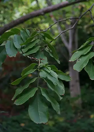 Die Blätter sind 20 bis 25 cm lang, unpaarig gefiedert und haben einen 2,5 bis 5 cm langen Blattstiel. Die Blätter sind behaart, seltener verkahlend, die Rhachis ist behaart. Das Blatt besteht aus 7 bis 9 (selten 5 bis 11) Fiederblättchen. Die seitlichen Fiederblättchen sind sitzend oder maximal 2 mm lang gestielt. Ihre Spreite ist elliptisch-oval bis breit lanzettlich, 5 bis 14 cm lang und 2 bis 6 cm breit. Die Unterseite ist entlang der Mittelrippe und den Seitenrippen nächster Ordnung behaart. Die Blättchenbasis ist asymmetrisch, breit keilförmig bis gerundet, die Spitze stumpf bis zugespitzt. Das endständige Fiederblättchen ist 1 bis 15 mm lang gestielt.