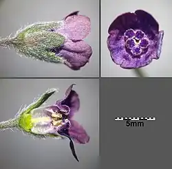 Die zwittrigen[1][5] Blüten sind meist fünfzählig und radiärsymmetrisch mit doppelter Blütenhülle. Die fünf dicht behaarten Kelchblätter sind nur an ihrer Basis verwachsen. Die fünf Kelchzipfel sind elliptisch und während der Anthese 4 bis 5 später 8 Millimeter lang.[4] Die fünf Kronblätter bei einem Durchmesser von etwa 6 Millimetern röhrenförmig verwachsen und am oberen Ende trichterartig erweitert.[2] Die Blütenkrone ist erst dunkelviolett, später braun-rot.[2] Die Blütenkronröhre ist wenig länger als die Kelchblätter und ist durch Hohlschuppen (Schlundschuppen)[1] verschlossen. Die Staubblätter sind kürzer als die Schlundschuppen.[4]
