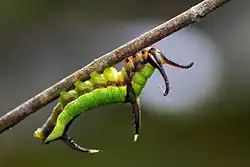 Junge Raupen sind zunächst glasig hellbraun gefärbt. Ab dem dritten Stadium nehmen sie eine überwiegend grüne Farbe mit einem rotbraunen Seitenstreifen an und es wachsen ihnen zwei dunkelbraune, raue Tuberkel am Kopf sowie weitere auf dem Rücken nach ca. einem Drittel der Körperlänge und am Analsegment, deren Spitzen weißlich gefärbt sind.