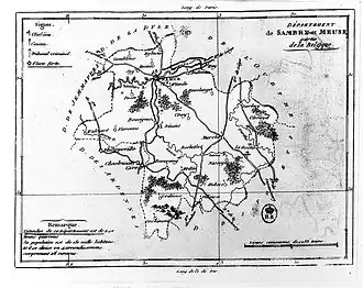 Hauptort (chef-lieu) des Departements bzw. Sitz der Präfektur war die Stadt Namur an der Mündung der Sambre in die Maas.[3] Es war in vier Arrondissements und 21 Kantone sowie 488 Gemeinden eingeteilt:[4][5]