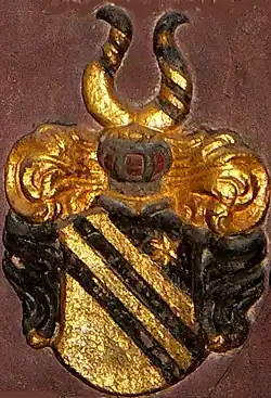 Blasonierung: Von Schwarz und Silber mehrfach schrägrechts geteilt. Im linken Obereck ein silberner Stern. Auf dem Helm mit schwarz-silbernen Decken mehrfach von Schwarz und Silber geteilte Büffelhörner.[3]