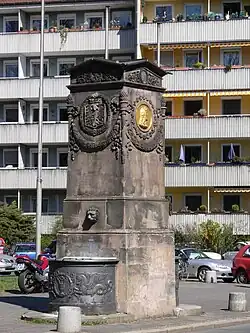 - ↑ Ursprünglich hatte der Tritonbrunnen noch zwei kleinere Nebenbrunnen, die jeweils am westlichen und östlichen Platzende Aufstellung fanden, soweit auf einem Stahlstich von Delsenbach, datiert 1720, erkennbar. Der Verbleib dieser Nebenbrunnen ist unklar.