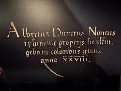 - Albertus Durerus Noricus / ipsum me propriis sic effin / gebam coloribus aetatis / anno XXVIII