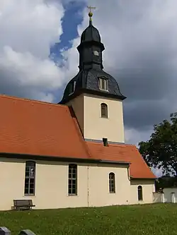 - Dorfkirche Dürrenebersdorf. Der Turm mit barockem Schweifkuppelhelm wurde 1786 errichtet, der Innenraum 2021 neugestaltet.