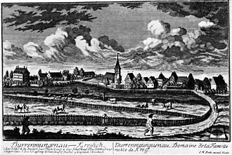 Während des Dreißigjährigen Krieges wurden das Schloss und der Ort ausgeplündert und größtenteils zerstört. Die Bewohner wurden entweder vertrieben oder getötet, so dass der Ort ab 1642 eine menschenleere Wüstung war.[17] 1651 kaufte der Nürnberger Patrizier Jobst Christoph Kreß von Kressenstein das Rittergut. Durch den Besitz von Dürrenmungenau wurden die Kreß im Kanton Altmühl in die Reichsritterschaft in Franken immatrikuliert.[18] Jobst Christoph Kreß baute das Schloss und die Kirche wieder auf[19] und leitete die neue Besiedelung ein. Die Wiederbesiedelung erfolgte ab 1656 v. a. durch protestantische Glaubensflüchtlinge aus dem niederösterreichischen Waldviertel, dem oberösterreichischen Mühlviertel (hier besonders aus dem „Ländlein ob der Enns“) und aus der Oberpfalz.[20]