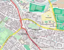 Zwischen dem Markgräfin-Wilhelmine-Gymnasium und der Äußeren Badstraße liegt der 1964 eröffnete städtische Volksfestplatz. Das erste Bayreuther Volksfest wurde 1910 vom Fremdenverkehrsverein am Mainflecklein veranstaltet, in der Zeit nach dem Zweiten Weltkrieg fand die Veranstaltung zunächst an der heutigen Albrecht-Dürer-Straße statt. In der Zeit des Nationalsozialismus diente das Gelände als „Gausportfeld“, bis in die 1960er Jahre hinein dann als Standort einer Barackensiedlung für Ausgebombte und Flüchtlinge.[12]