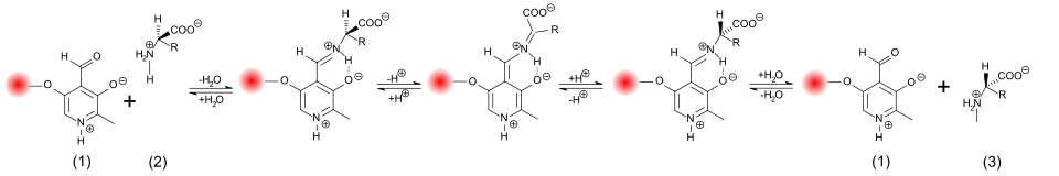 Die basen- und die säurenkatalysierte Racemisierung benötigen recht drastische Reaktionsbedingungen, um in wenigen Stunden eine vollständige Racemisierung zu erhalten. Im Gegensatz dazu verläuft die enzymkatalysierte Racemisierung in biologischen Systemen wesentlich schneller und unter sehr milden Bedingungen – im neutralen pH-Bereich und bei Raum- beziehungsweise Körpertemperatur. Die Racemasen katalysieren die Deprotonierung am α-C-Atom der Aminosäure. Das Wasserstoffatom ist in dieser Position nur äußerst schwach sauer. Die Säurekonstante der protonierten Form hat einen pKs-Wert von ≈21 und ist am isoelektrischen Punkt mit ≈29 noch schwächer.[30][31] Die Abspaltung des Protons wird bei den meisten Racemasen durch Pyridoxalphosphat (PLP) wesentlich erleichtert. Im aktiven Zentrum dieser Enzyme ist das PLP an einen Lysinrest gebunden. Die Aminogruppe der L-Aminosäure bindet dabei an die Aldehyd-Gruppe des PLP und bildet so eine Schiffsche Base (Aldimin). Als elektrophiler Katalysator zieht das PLP über den aromatischen Ring Elektronen vom α-C-Atom der Aminosäure ab, das dadurch wesentlich leichter deprotoniert. Zudem wird das verbleibende Anion mesomer stabilisiert. Eine Reprotonierung und Addition von Wasser setzt dann die racemisierte Aminosäure als Reaktionsprodukt durch Hydrolyse der Schiffschen Base frei.[32]