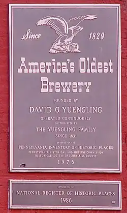 Der Deutsche David Gottlob Jüngling wanderte 1823 von Aldingen (heute Ortsteil von Remseck am Neckar) in die Vereinigten Staaten aus. Bereits sein Vater Friedrich Jüngling war Bierbrauer, der eine lokale Brauerei in Räumen des Aldinger Schlosses betrieb.[1] David Jüngling anglisierte seinen Nachnamen zu Yuengling und gründete 1829 die Eagle Brewery in Pottsville. Als 1873 Jünglings Sohn Frederick in die Brauerei einstieg, wurde der Name auf D. G. Yuengling and Son umgeändert, der Weißkopfseeadler blieb jedoch als Logo erhalten. Im späten 19. Jahrhundert wurden auch Brauereien in Saratoga, New York City, und Trail in British Columbia gegründet. Aufgrund der stark wachsenden Originalbrauerei in Pottsville wurden die anderen Brauereien schließlich aufgelassen und die Produktion auf Pottsville konzentriert.[2]