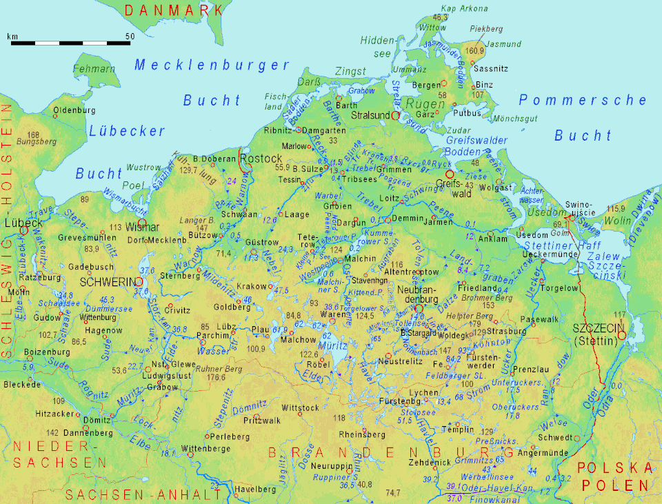 - Das nordöstliche Flachland umfasst etwa das Vorpommersche Festland. Es hat überwiegend lehmige Böden und liegt insgesamt weniger als 50 m über NHN. Die Spiegel der meisten Gewässer liegen sogar weniger als 10 m über dem Meer.