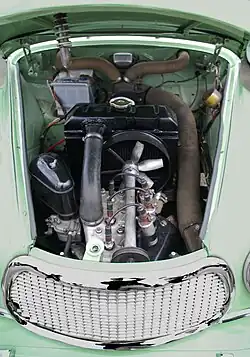 Der vorn längs eingebaute Zweitaktmotor ist wassergekühlt. Der Kühler sitzt erhöht hinter dem Motor, der Kühlkreislauf arbeitet ohne Wasserpumpe (Thermosiphonkühlung) und braucht daher einen Kühlerschlauch mit großem Fließquerschnitt. Die verteilerlose Zündanlage arbeitet mit drei Zündunterbrechern vorn an der Kurbelwelle und drei Zündspulen. Ein Keilriemen treibt Lichtmaschine und Kühlerventilator. Der Lufteinlass mit Filter und der Vergaser sitzen in Fahrtrichtung gesehen rechts. Es gibt keine Ansatzmöglichkeit für eine Startkurbel wie bei manchen früheren Modellen.