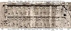 Alle sechs Gräber von Naqsch-e Rostam und Persepolis sind mit den 30 Thronträgern in der gleichen Anordnung ausgestattet. Von den sechs Gräbern enthalten das Grab I mit der Inschrift DNe und das Grab V mit der Inschrift A3Pb die dreisprachigen Beischriften der Völker. Neben den beiden Gräbern liefern auf der Liste der achämenidischen Königsinschriften die Inschriften DB, DNa, DPh, DPe, DSe, XPh und eine Stele aus Tell el-Maschuta[9] Namen von Ländern oder Völkern. Die Inschriften unterscheiden sich in der Anzahl der Länder, beziehungsweise der Völker, und der Reihenfolge. Die Inschrift DPh zum Beispiel listet nur die äußersten Regionen, um die Größe des achämenidischen Reichs auszudrücken, und die älteste Inschrift von Dareios I., DB in Behistun, listet 23 Länder im Gegensatz zu DNa, DNe, DSe und A3Pb mit 30 Ländern, beziehungsweise Völkern.[10]