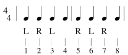 Auf den ersten 3 Schlägen erfolgt eine Bewegung nach links und die letzten drei Schritte erfolgen am Platz. Die Arme werden hierzu rhythmisch nach vorne geschwungen.