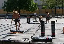 Dachdichtungsbahnen werden genagelt, mithilfe von Bitumenklebemasse verklebt oder lose verlegt und durch Auflast gesichert. Alternativ sind kaltselbstklebende Bitumenbahnen erhältlich. - Bitumen-Schweißbahnen sind deutlich dicker und werden nicht lose verlegt, sondern durch Flämmen verschweißt. Diese sind daher nur einseitig besandet oder beschiefert und auf der zu verschweißenden Seite mit Talkum oder Folie beschichtet. Mit Bitumen-Schweißbahnen lassen sich Abdichtungen gegen stehendes und drückendes Wasser ausführen.[12]