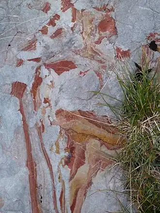 Im gebankten Dachsteinkalk finden sich manchmal unregelmäßig geformte, zentimeter- bis mehrere Dezimeter große, rot-ockergelb gestreifte Ausfüllungen von Lösungshohlräumen. Aber auch Hohlräume von Fossilienschalen (z. B. von Megalodonten), die durch Kalklösung entstanden sind, können gefüllt sein. Die Ursache für diese, als Rote Scherben bezeichneten, Bildungen ist das temporäre Trockenfallen riesiger Flachmeerbereiche, das unmittelbar nach der Diagenese der kalkigen Ablagerungen zu ihrer Verkarstung führte (Paläokarst). Das tonig-siltige Material stammt von verschwemmten roten Bodenbildungen, die auf Inseln durch die Kalklösung im trockengefallenen Dachsteinkalk gebildet wurden. Derartige Bodenbildungen entstehen auch heute noch in tropischen Karst-Gebieten.[2]