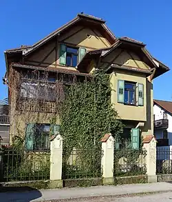 Die Villa, die zur Frühbebauung der Waldkolonie Pasing gehört, ist ein einfacher Giebelbau mit Krüppelwalm, der durch Vorsprünge, Erker und Querdächer unübersichtlich erscheint. Die Gartenmauer mit Halbkreisöffnungen ist ebenfalls denkmalgeschützt.