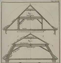 - ↑ Leonhard Christoph Sturm: Kurtze Vorstellung der gantzen Civil-Bau-Kunst. Worinnen erstlich die vornehmsten Kunst-Wörter […]. Wolff, Augspurg 1718, S. 21, Nr. 215; gdz.sub.uni-goettingen.de – Nota: „[…] eine solche Verbindung dienete nicht nur/ daß man durch Hülffe derselben das Dach leichter richten konte/sondern sie auch hernach das Dach zu stützen dienete.“