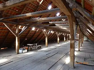Großes Pfettendach: Der Dachstuhl ist als Binder (Dachbinder) ausgeführt, alle fünf Sparrenfelder ein Binder. Der Längsverband, aus Firstpfette und Mittelpfetten, ist mit Kopfbändern ausgesteift (Kopfbandpfetten). Die Hängepfosten mit angehängtem Binderbalken (Bundbalken) sind hier nicht weiter belastet. Die Bundbalken sind mit einer doppelten Brettreihe in Längsrichtung stabilisiert. -