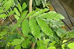 Die meistens wechselständigen, gestielten Blätter sind meistens unpaarig gefiedert und bis zu 40 Zentimeter lang, mit mehr oder weniger behaarter Rhachis. Die gestielten, glänzenden und ganzrandigen Blättchen sind bis zu 20 Zentimeter lang und eiförmig bis lanzettlich oder länglich, seltener verkehrt-eiförmig, sowie spitz bis zugespitzt oder geschwänzt. Die hellere Blättchenunterseite ist mehr oder weniger behaart, besonders auf der hervorstehenden, dicken, bräunlichen Mittelader. Es sind abfallende Pseudonebenblätter vorhanden (kleine modifizierte Blättchen).[2][3]