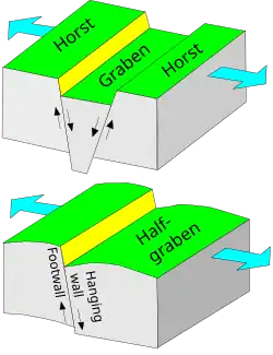 In der weiteren Folge entstanden zwischen den Kongo-SF- und Kalahari-Kratonen zwei annähernd parallele intra-kontinentale Grabenbrüche[10]. Die Grabenbrüche bildeten Becken, in denen sich verschiedene Graben-Horst-Systeme, Halbgraben (engl. Half-graben), Rücken und Verwerfungen entwickelten.