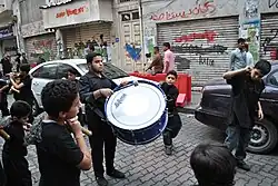 Bei den Trauerzeremonien zu Muharram (taschābah) werden in den ersten zehn Tagen des Monats Muharram die historischen Ereignisse, die zum Tod Husains führten, mit Darstellern in Kostümen und Pferden vor Kulissen inszeniert. Eine Form der Passionsspiele ist Ta'zieh. Zur Charakterisierung jeder Hauptfigur gehören bestimmte Melodielinien, Rhythmen und Musikinstrumente. Trommeln, Becken und Trompeten bringen die Atmosphäre des Schlachtfeldes von Kerbela nahe. Früher dienten mancherorts in Iran die möglichst laut geschlagenen Trommeln in einer Art religiösem Wettbewerb dazu, eine der Ta’zieh aufführenden Gruppen gegenüber anderen, verfeindeten Religionsgruppen als noch eindrucksvoller erscheinen zu lassen.[10]