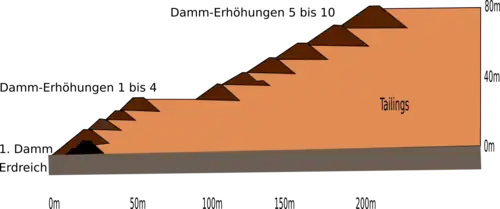 Mit dem Bau des Damms wurde 1976 begonnen und er wurde in zehn Schritten aufgestockt auf eine Endhöhe von 86 m.[3] Die Einzeldämme hatten dabei rund 5 bis 8 m Höhe. Für den Bau wurden anfangs Abraum aus dem Bergbau und dann Böden (Laterit) aus der Umgebung benutzt, die verdichtet wurden, später (in den letzten sechs Stufen) wurden die getrockneten Tailings des Absetzbeckens genommen. Er besteht zu 56 Prozent aus Feinsand, 28 Prozent Schluff, 8 Prozent Mittelsand und 4 Prozent Ton.